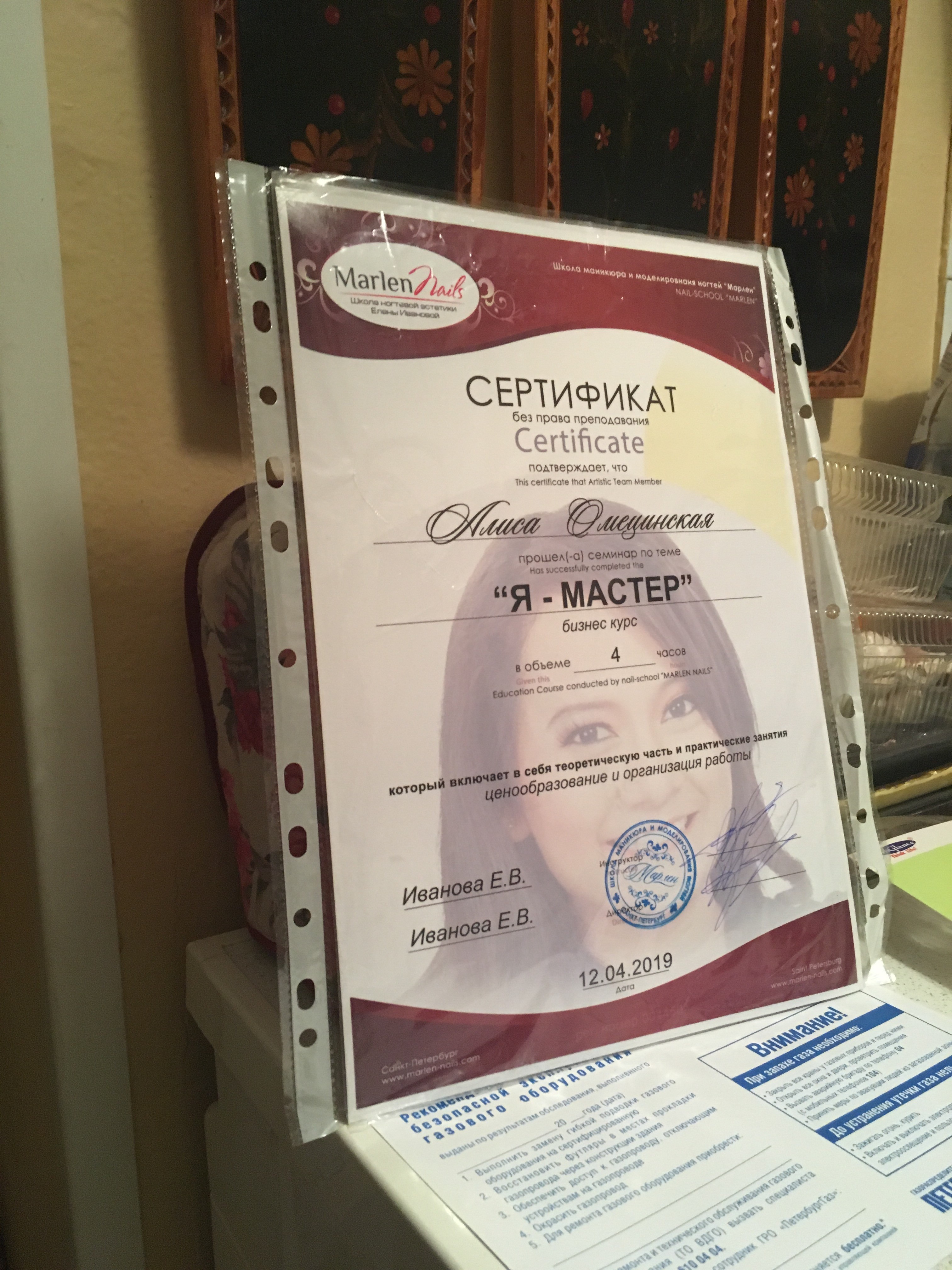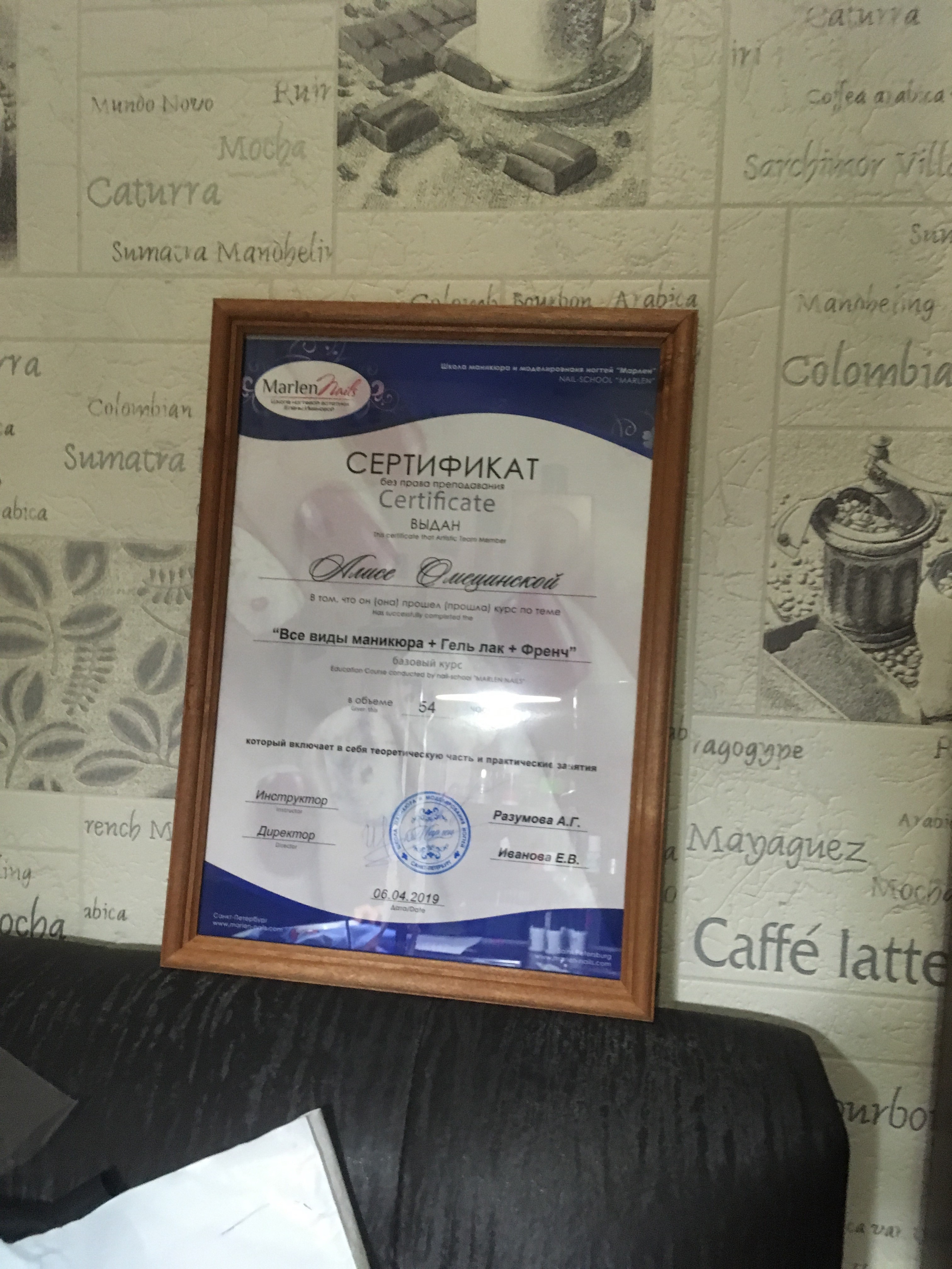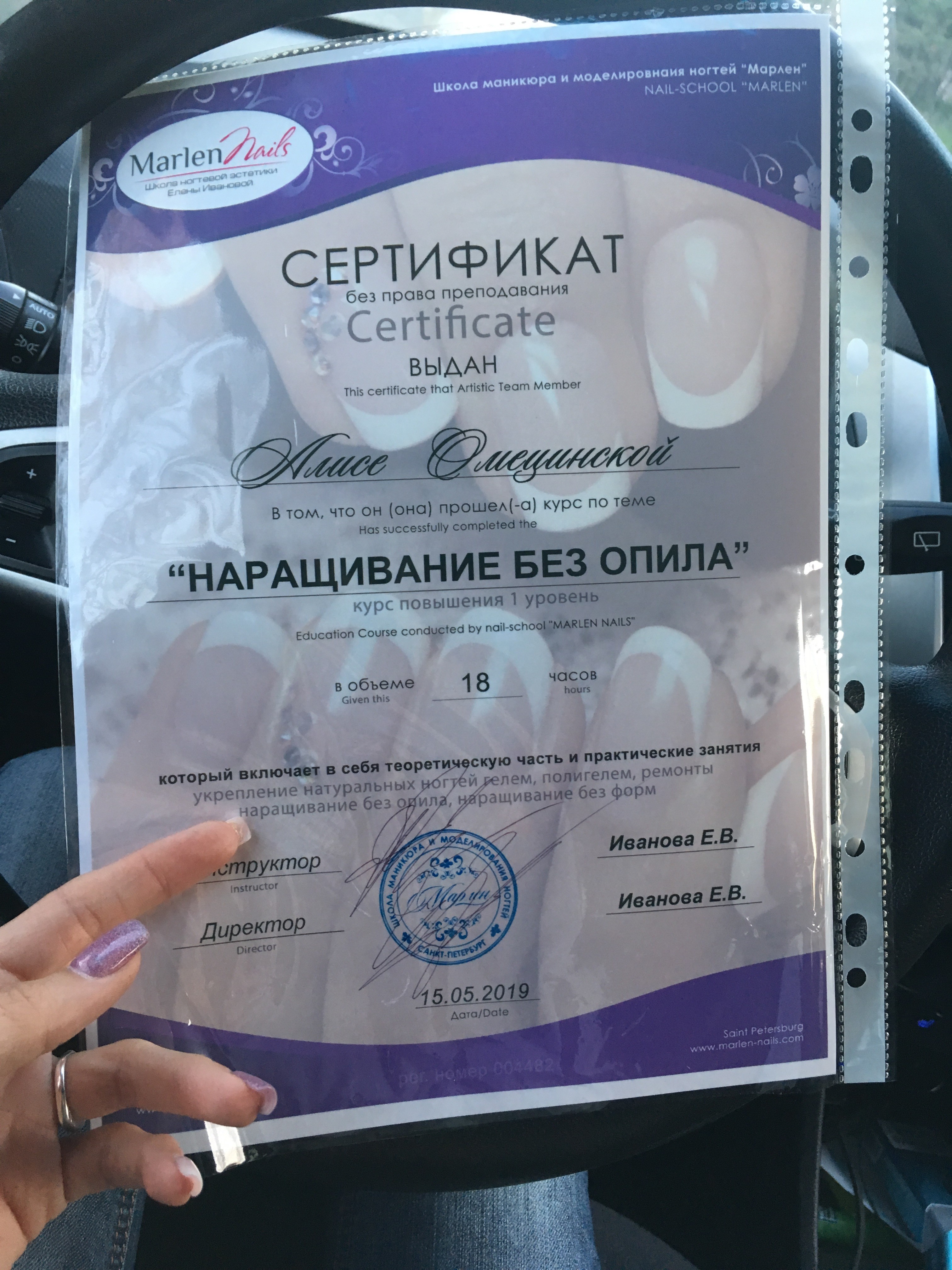 Я закончила базовые курсы одной из самых сильных школ в СПб (где, действительно, УЧАТ), школу ногтевой эстетики Марлен. На данный момент окончены курсы: «Все виды маникюра+гель лак +френч» и «Я-мастер», «Салонное моделирование», «Наращивание без опила», «5 техник работы с полигелем». Я перфекционист, поэтому работать «тяп-ляп» не умею и не буду. Время выполнения маникюра с покрытием 2-2:15, с гарантией 7 дней на покрытие. Работаю без пропилов и порезов. Работаю только с проверенными материалами: RuNail, Patriza Nail, Kodi. Все не одноразовые инструменты проходят дезинфекцию и стерилизацию.